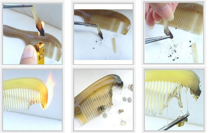 (แถวบน) คือหวีเขาสัตว์แท้ที่นำมาเผาไฟ (แถวล่าง) หวีเขาสัตว์ปลอมที่ทำจากพลาสติก